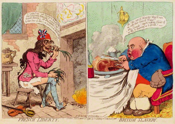 Английский художник Джеймс Гилрей, карикатуры которого будут присутствовать в этом материале, был консерватором и отрицательно относился к Великой Французской революции 1789 г. На этой карикатуре Джеймс Гилрей противопоставляет «французскую свободу» «английскому рабству»