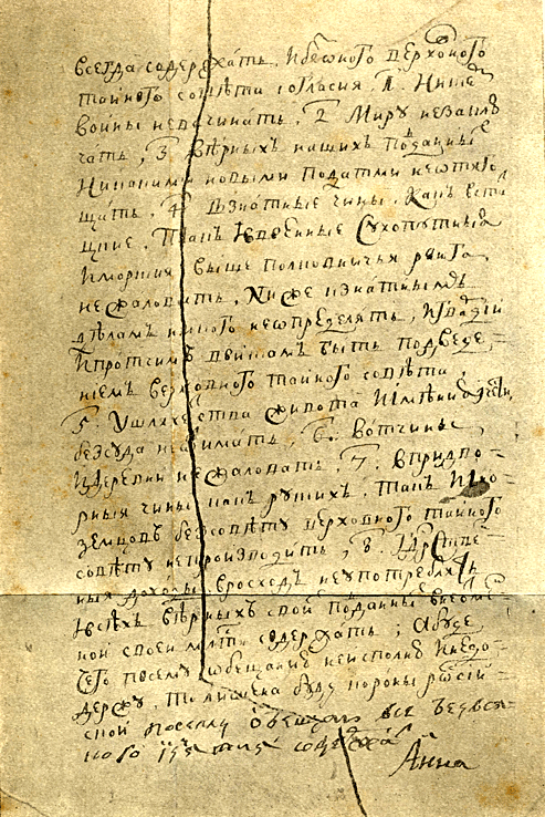 Понеже по воле всемогущего бога и по общему желанию российского народа мы по преставлении всепресветлейшего державнейшего Великого государя Петра второго, императора и самодержца всероссийского, нашего любезнейшего государя племянника, императорский всероссийский престол восприяли и, следуя божественному закону, правительство свое таким образом вести намерена и желаю, дабы оное в начале к прославлению божеского имени и к благополучию всего нашего государства и всех верных наших подданных служить могло. — Того ради, чрез сие наикрепчайше обещаемся, что и наиглавнейшее мое попечение и старание будет не только о содержании, но и крайнем и всевозможном распространении православные нашея веры греческого исповедания, такожде, по приятии короны российской, в супружество во всю мою жизнь не вступать и наследника, ни при себе, ни по себе никого не определять. Еще обещаемся, что понеже целость и благополучие всякого государства от благих советов состоит, того ради мы ныне уже учрежденный Верховный тайный совет в восьми персонах всегда содержать и без оного Верховного тайного совета согласия: